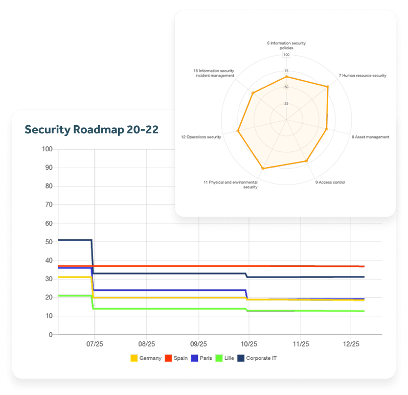 Analyze your risks with a business catalog, harmonize your treatment plan with compliance requirements, and manage in real-time with optimal visibility into their current status.